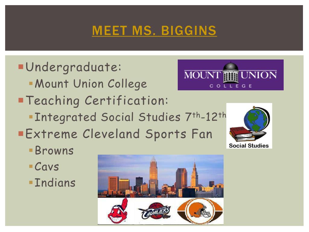 Meet Ms. Biggins • Undergraduate: • Mount Union College • Teaching Certification: • Integrated Social Studies 7th-12th • Extreme Cleveland Sports Fan • Browns • Cavs • Indians