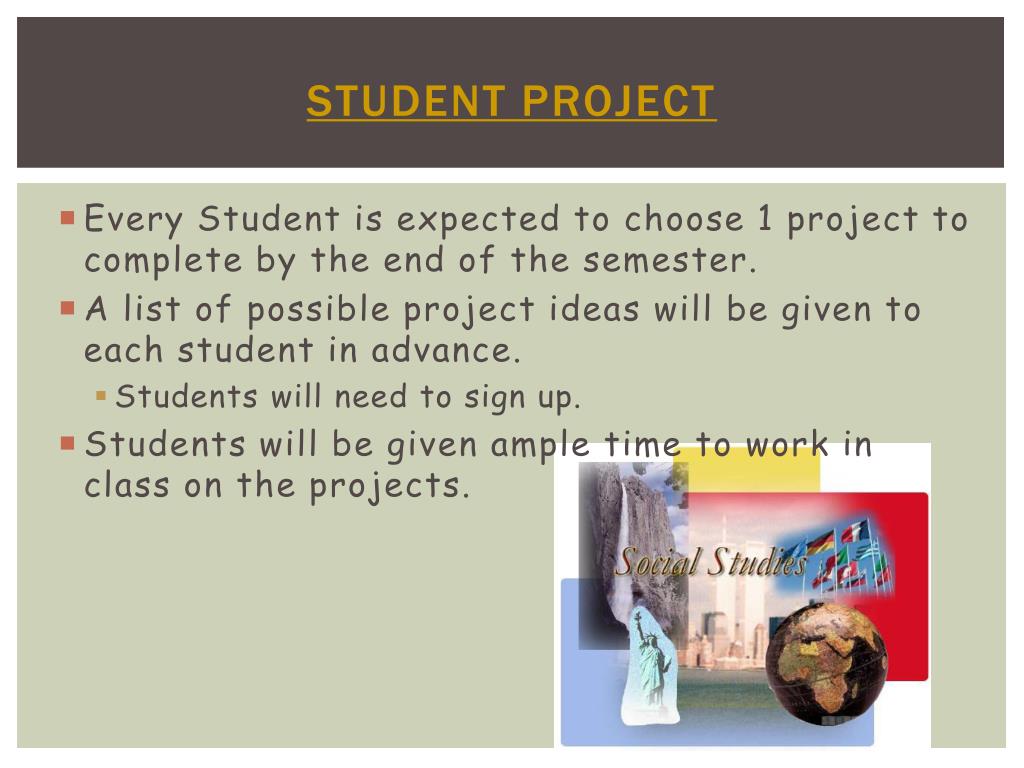 Student Project • Every Student is expected to choose 1 project to complete by the end of the semester. • A list of possible project ideas will be given to each student in advance. • Students will need to sign up. • Students will be given ample time to work in class on the projects.