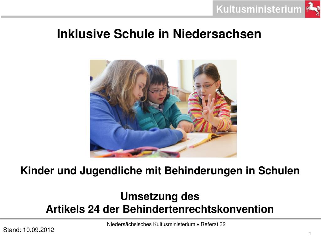 Inklusive Schule in Niedersachsen Kinder und Jugendliche mit Behinderungen in Schulen Umsetzung des Artikels 24 der Behindertenrechtskonvention Stand: 10.09.2012 1