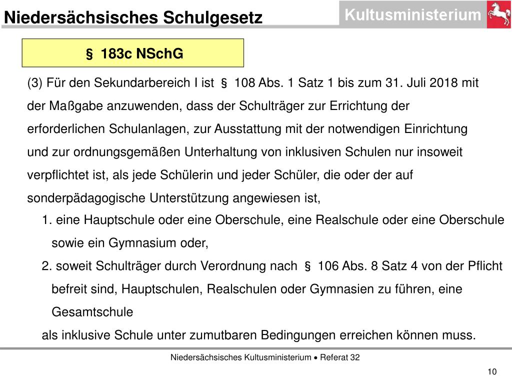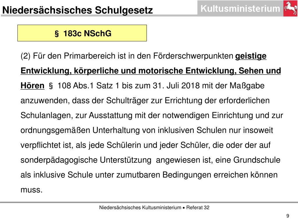 Niedersächsisches Schulgesetz § 183c NSchG (2) Für den Primarbereich ist in den Förderschwerpunkten geistige Entwicklung, körperliche und motorische Entwicklung, Sehen und Hören§ 108 Abs.1 Satz 1 bis zum 31. Juli 2018 mit der Maßgabe anzuwenden, dass der Schulträger zur Errichtung der erforderlichen Schulanlagen, zur Ausstattung mit der notwendigen Einrichtung und zur ordnungsgemäßen Unterhaltung von inklusiven Schulen nur insoweit verpflichtet ist, als jede Schülerin und jeder Schüler, die oder der auf sonderpädagogische Unterstützung angewiesen ist, eine Grundschule als inklusive Schule unter zumutbaren Bedingungen erreichen können muss. 9