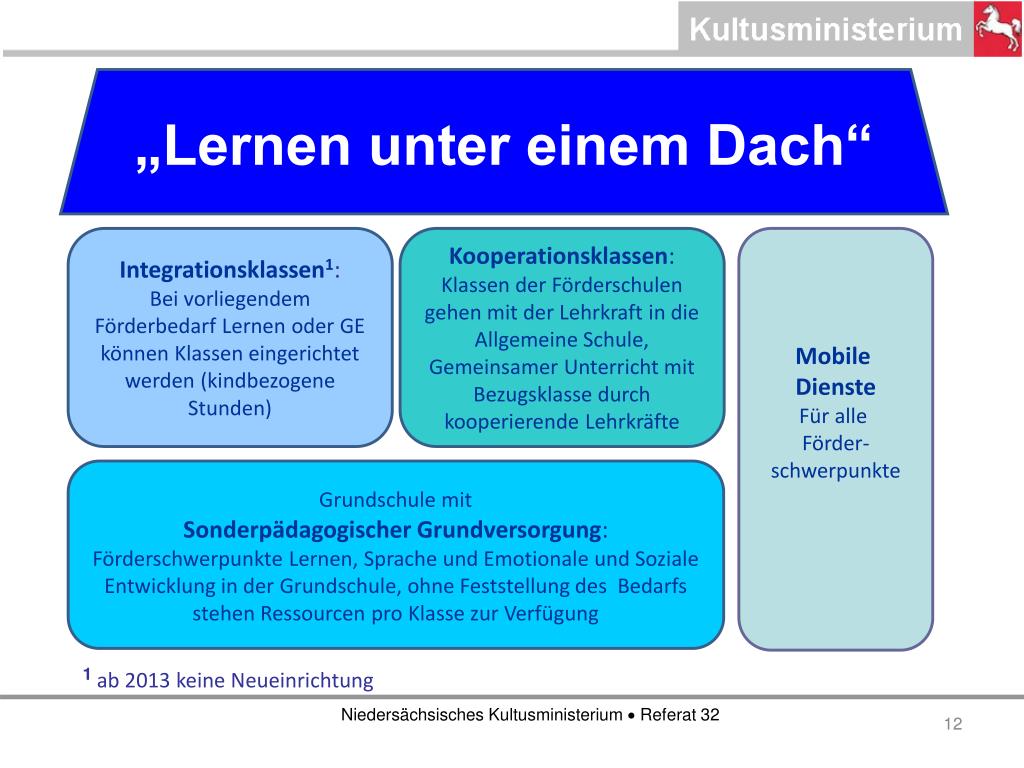 „Lernen unter einem Dach“ Integrationsklassen1: Bei vorliegendem Förderbedarf Lernen oder GE können Klassen eingerichtet werden (kindbezogene Stunden) Kooperationsklassen: Klassen der Förderschulen gehen mit der Lehrkraft in die Allgemeine Schule, Gemeinsamer Unterricht mit Bezugsklasse durch kooperierende Lehrkräfte Mobile Dienste Für alle Förder- schwerpunkte Grundschule mitSonderpädagogischer Grundversorgung: Förderschwerpunkte Lernen, Sprache und Emotionale und Soziale Entwicklung in der Grundschule, ohne Feststellung des Bedarfs stehen Ressourcen pro Klasse zur Verfügung 1 ab 2013keine Neueinrichtung 12