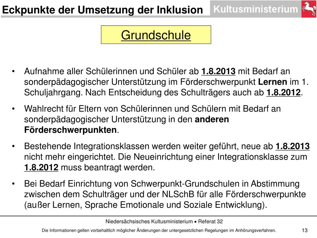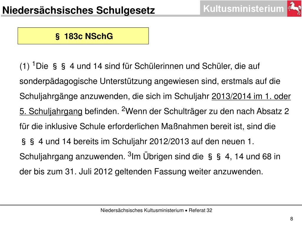 Niedersächsisches Schulgesetz § 183c NSchG (1) 1Die §§ 4 und 14 sind für Schülerinnen und Schüler, die auf sonderpädagogische Unterstützung angewiesen sind, erstmals auf die Schuljahrgänge anzuwenden, die sich im Schuljahr 2013/2014 im 1. oder 5. Schuljahrgang befinden. 2Wenn der Schulträger zu den nach Absatz 2 für die inklusive Schule erforderlichen Maßnahmen bereit ist, sind die §§ 4 und 14 bereits im Schuljahr 2012/2013 auf den neuen 1. Schuljahrgang anzuwenden. 3Im Übrigen sind die §§ 4, 14 und 68 in der bis zum 31. Juli 2012 geltenden Fassung weiter anzuwenden. 8