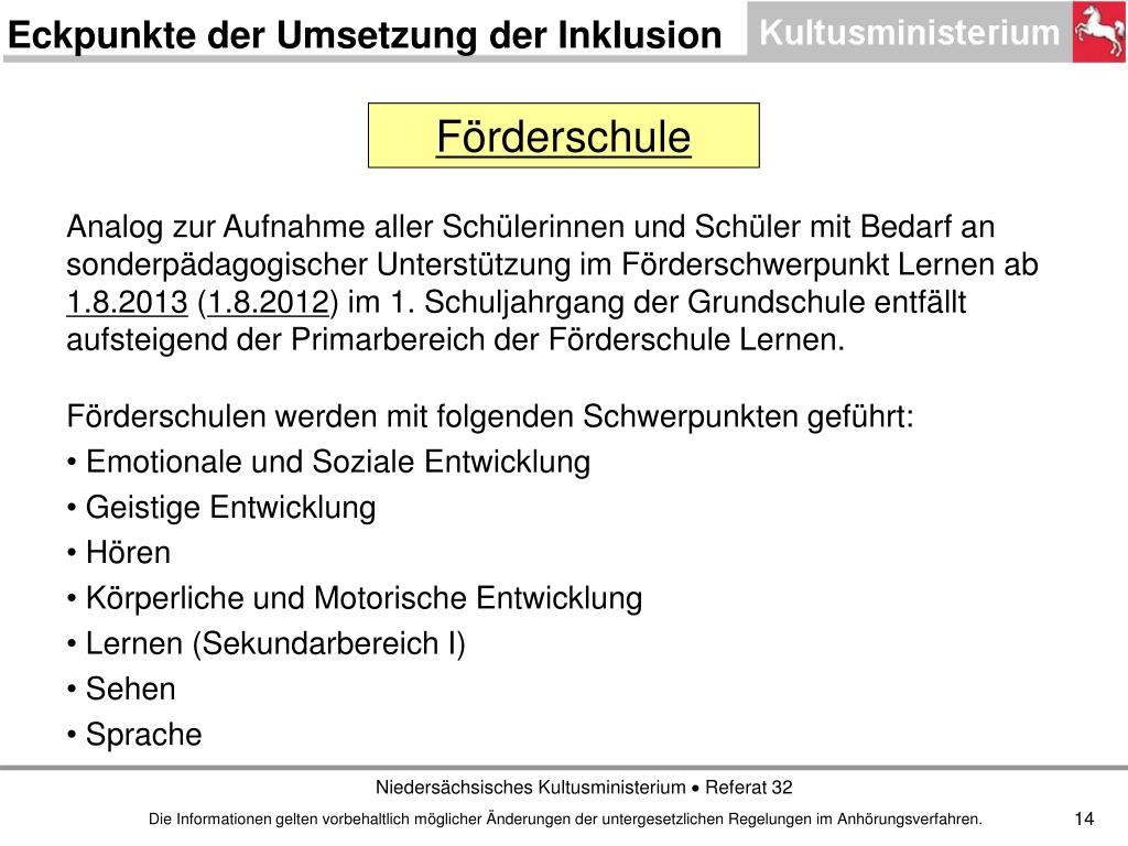 Eckpunkte der Umsetzung der Inklusion Grundschule • Aufnahme aller Schülerinnen und Schüler ab 1.8.2013mit Bedarf an sonderpädagogischer Unterstützung im Förderschwerpunkt Lernen im 1. Schuljahrgang. Nach Entscheidung des Schulträgers auch ab 1.8.2012. • Wahlrecht für Eltern von Schülerinnen und Schülern mit Bedarf an sonderpädagogischer Unterstützung in den anderen Förderschwerpunkten. • Bestehende Integrationsklassen werden weiter geführt, neue ab 1.8.2013 nicht mehr eingerichtet. Die Neueinrichtung einer Integrationsklasse zum 1.8.2012 muss beantragt werden. • Bei Bedarf Einrichtung von Schwerpunkt-Grundschulen in Abstimmung zwischen dem Schulträger und der NLSchB für alle Förderschwerpunkte (außer Lernen, Sprache Emotionale und Soziale Entwicklung). 13 Die Informationen gelten vorbehaltlich möglicher Änderungen der untergesetzlichen Regelungen im Anhörungsverfahren.