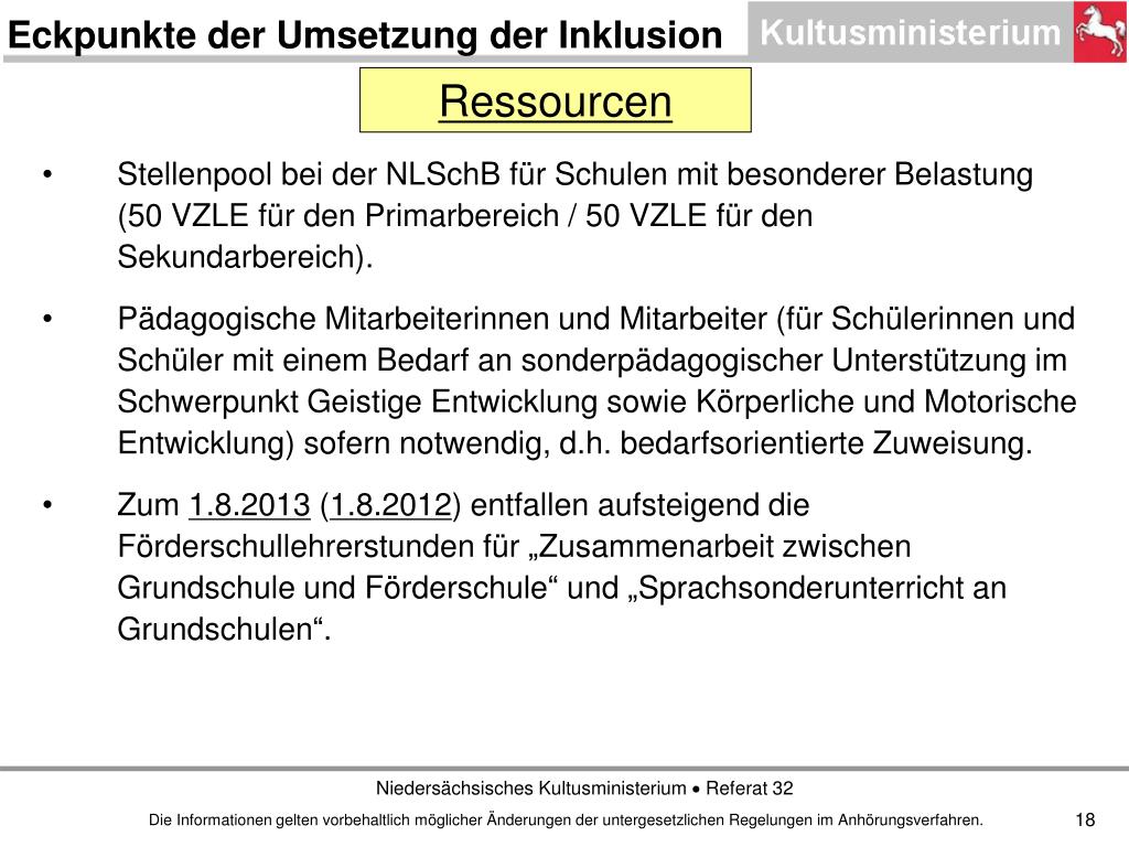 Eckpunkte der Umsetzung der Inklusion Ressourcen • Grundschule: Ab 1.8.2013 (1.8.2012) bis zum 1.8.2016 (1.8.2015) aufsteigende Ausstattung mit einer sonderpädagogischen Grundversorgung (durchschnittlich 2 Std. pro Klasse, Verteilung nach Bedarf). • Grundschule: 3 bis 5 Förderschullehrerstunden je nach Förderschwerpunkt (außer Lernen, Emotionale und Soziale Entwicklung sowie Sprache). • Grundschule: systembezogenen Ressourcen für den für Schülerinnen und Schüler mit einem Bedarf an sonderpädagogischer Unterstützung im Bereich Emotionale und Soziale Entwicklung • Weiterführende Schule: 3 bis 5 Förderschullehrerstunden je nach Förderschwerpunkt. • Die Zählung von Schülerinnen und Schülern mit einem festgestellten Bedarf an sonderpädagogischer Unterstützung erfolgt entsprechend der Regelung für Integrationsklassen (Doppelzählung). 17 Die Informationen gelten vorbehaltlich möglicher Änderungen der untergesetzlichen Regelungen im Anhörungsverfahren.