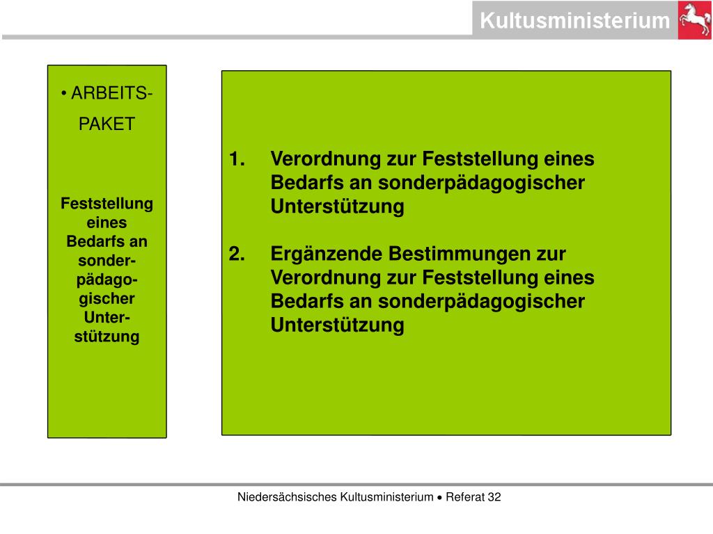 ARBEITS- PAKET • Feststellung eines • Bedarfs an sonder-pädago-gischer Unter-stützung Verordnung zur Feststellung eines Bedarfs an sonderpädagogischer Unterstützung Ergänzende Bestimmungen zur Verordnung zur Feststellung eines Bedarfs an sonderpädagogischer Unterstützung