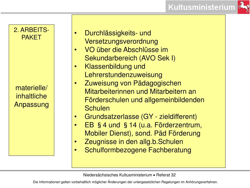 Durchlässigkeits- und Versetzungsverordnung • VO über die Abschlüsse im Sekundarbereich (AVO Sek I) • Klassenbildung und Lehrerstundenzuweisung • Zuweisung von Pädagogischen Mitarbeiterinnen und Mitarbeitern an Förderschulen und allgemeinbildenden Schulen • Grundsatzerlasse (GY - zieldifferent) • EB §4 und §14 (u.a. Förderzentrum, Mobiler Dienst), sond. Päd Förderung • Zeugnisse in den allg.b.Schulen • Schulformbezogene Fachberatung 2. ARBEITS- PAKET materielle/ inhaltliche Anpassung Die Informationen gelten vorbehaltlich möglicher Änderungen der untergesetzlichen Regelungen im Anhörungsverfahren.