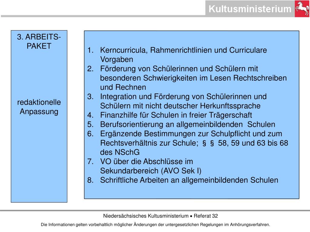 Kerncurricula, Rahmenrichtlinien und Curriculare Vorgaben Förderung von Schülerinnen und Schülern mit besonderen Schwierigkeiten im Lesen Rechtschreiben und Rechnen Integration und Förderung von Schülerinnen und Schülern mit nicht deutscher Herkunftssprache Finanzhilfe für Schulen in freier Trägerschaft Berufsorientierung an allgemeinbildenden Schulen Ergänzende Bestimmungen zur Schulpflicht und zum Rechtsverhältnis zur Schule; §§ 58, 59 und 63 bis 68 des NSchG VO über die Abschlüsse im Sekundarbereich (AVO Sek I) Schriftliche Arbeiten an allgemeinbildenden Schulen 3. ARBEITS- PAKET redaktionelle Anpassung Die Informationen gelten vorbehaltlich möglicher Änderungen der untergesetzlichen Regelungen im Anhörungsverfahren.