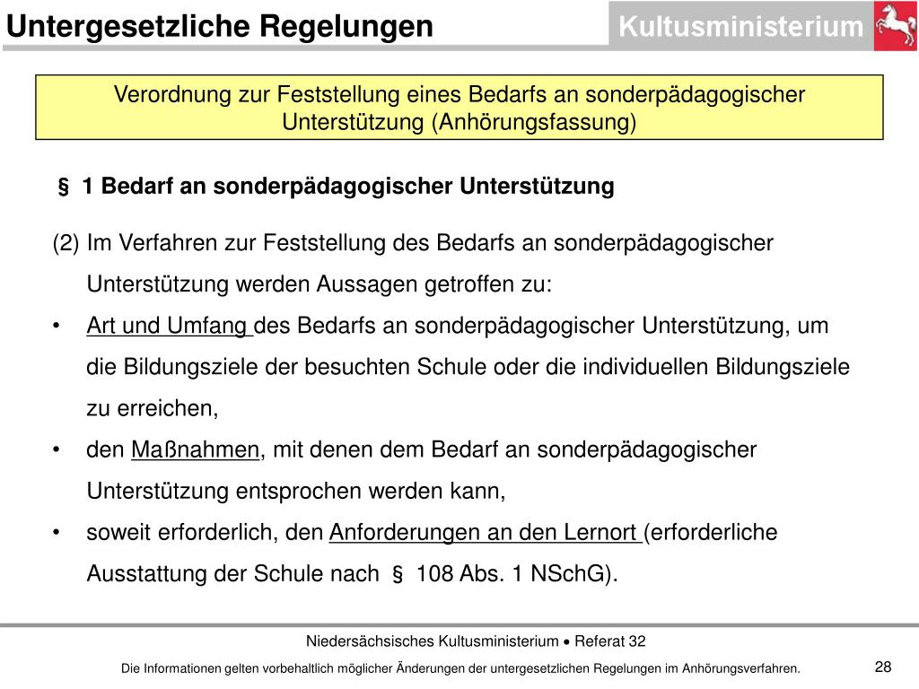 Untergesetzliche Regelungen Verordnung zur Feststellung eines Bedarfs an sonderpädagogischer Unterstützung (Anhörungsfassung) § 1 Bedarf an sonderpädagogischer Unterstützung (1) Ein Bedarf an sonderpädagogischer Unterstützung ist bei Kindern nach der Schulanmeldung oder bei Schülerinnen oder Schülern während des Schulbesuchs festzustellen, die aufgrund einer bestehenden oder drohenden Behinderung auf sonderpädagogische Unterstützung angewiesen sind. 27 Die Informationen gelten vorbehaltlich möglicher Änderungen der untergesetzlichen Regelungen im Anhörungsverfahren.