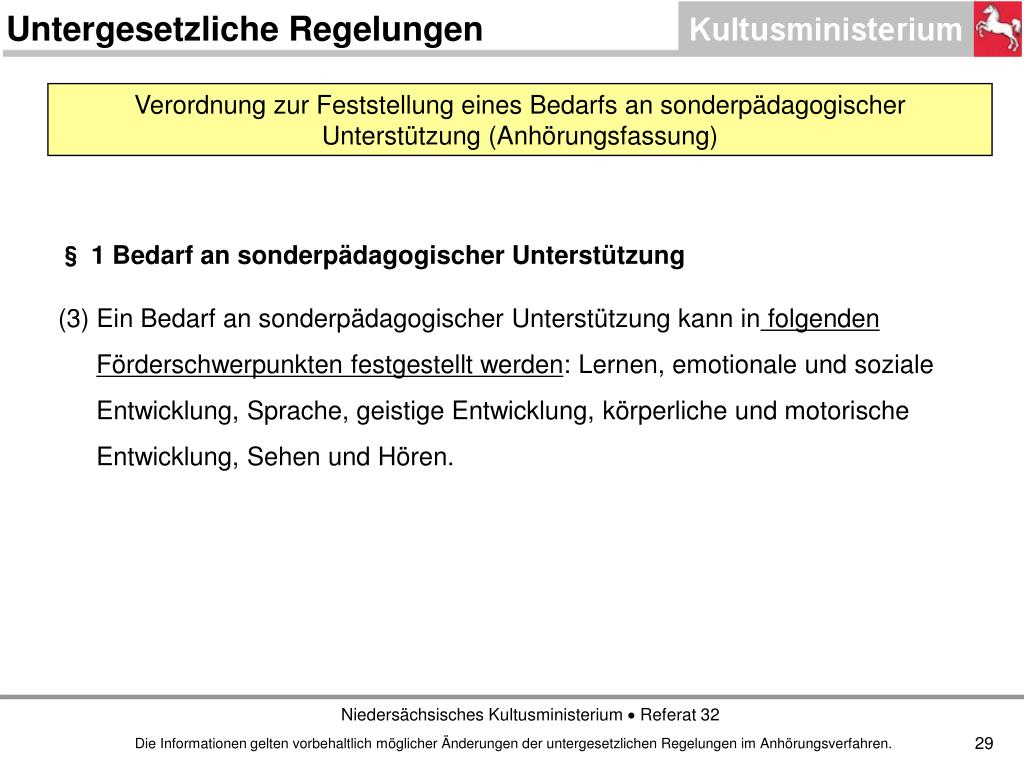 Untergesetzliche Regelungen Verordnung zur Feststellung eines Bedarfs an sonderpädagogischer Unterstützung (Anhörungsfassung) • § 1 Bedarf an sonderpädagogischer Unterstützung • (2) Im Verfahren zur Feststellung des Bedarfs an sonderpädagogischer Unterstützung werden Aussagen getroffen zu: • Art und Umfang des Bedarfs an sonderpädagogischer Unterstützung, um die Bildungsziele der besuchten Schule oder die individuellen Bildungsziele zu erreichen, • den Maßnahmen, mit denen dem Bedarf an sonderpädagogischer Unterstützung entsprochen werden kann, • soweit erforderlich, den Anforderungen an den Lernort (erforderliche Ausstattung der Schule nach § 108 Abs. 1 NSchG). 28 Die Informationen gelten vorbehaltlich möglicher Änderungen der untergesetzlichen Regelungen im Anhörungsverfahren.