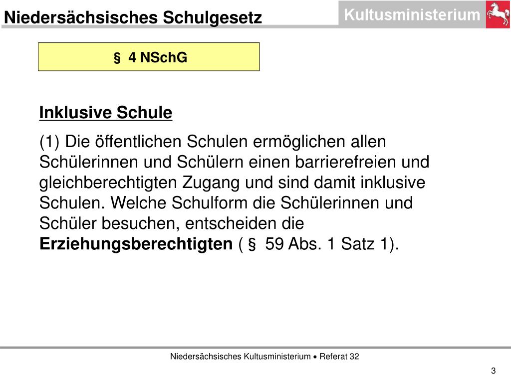 Niedersächsisches Schulgesetz § 4 NSchG Inklusive Schule (1) Die öffentlichen Schulen ermöglichen allen Schülerinnen und Schülern einen barrierefreien und gleichberechtigten Zugang und sind damit inklusive Schulen. Welche Schulform die Schülerinnen und Schüler besuchen, entscheiden die Erziehungsberechtigten (§ 59 Abs. 1 Satz 1). 3