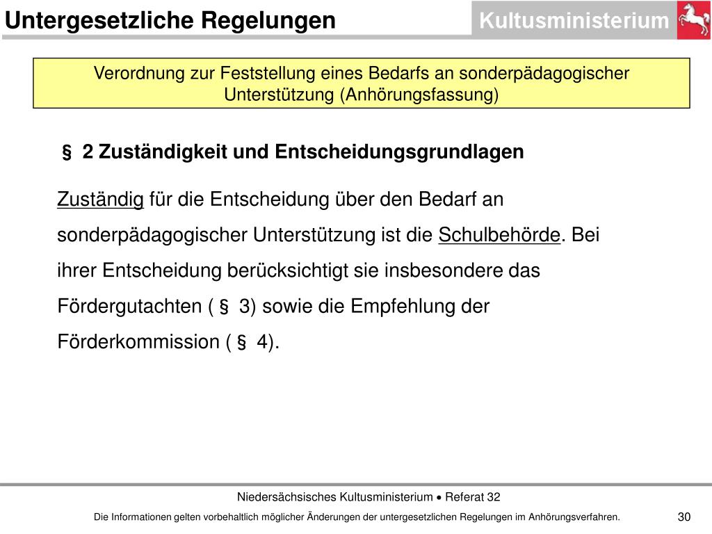Untergesetzliche Regelungen Verordnung zur Feststellung eines Bedarfs an sonderpädagogischer Unterstützung (Anhörungsfassung) § 2 Zuständigkeit und Entscheidungsgrundlagen Zuständig für die Entscheidung über den Bedarf an sonderpädagogischer Unterstützung ist die Schulbehörde. Bei ihrer Entscheidung berücksichtigt sie insbesondere das Fördergutachten (§ 3) sowie die Empfehlung der Förderkommission (§ 4). 30 Die Informationen gelten vorbehaltlich möglicher Änderungen der untergesetzlichen Regelungen im Anhörungsverfahren.