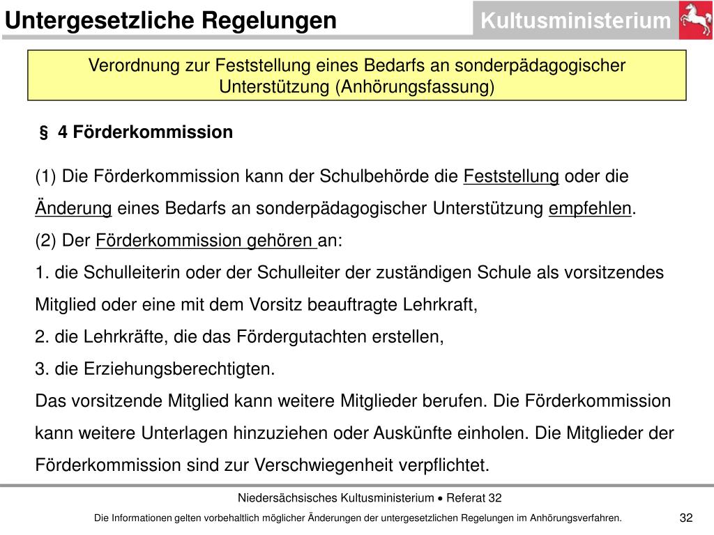 Untergesetzliche Regelungen Verordnung zur Feststellung eines Bedarfs an sonderpädagogischer Unterstützung (Anhörungsfassung) § 3 Verfahren und Fördergutachten (1) Bestehen Hinweise auf das Vorliegen oder die Änderung eines Bedarfs an sonderpädagogischer Unterstützung, leitet die Schulleiterin oder der Schulleiter der zuständigen Schule das Verfahren zur Feststellung eines Bedarfs an sonderpädagogischer Unterstützung ein. Hierüber sind die Erziehungsberechtigten unverzüglich schriftlich zu unterrichten. (2) Die Schulleiterin oder der Schulleiter kann Untersuchungen nach § 56 NSchG anordnen. (3) Die Schulleiterin oder der Schulleiter veranlasst die Erstellung eines Fördergutachtens durch eine Lehrkraft der Schule und eine Förderschullehrkraft als Grundlage der Arbeit der Förderkommission und beruft die Förderkommission ein. 31 Die Informationen gelten vorbehaltlich möglicher Änderungen der untergesetzlichen Regelungen im Anhörungsverfahren.