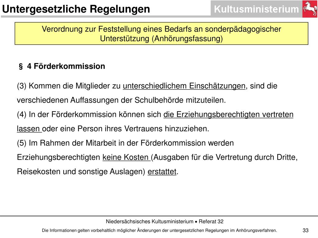 Untergesetzliche Regelungen Verordnung zur Feststellung eines Bedarfs an sonderpädagogischer Unterstützung (Anhörungsfassung) § 4 Förderkommission (3) Kommen die Mitglieder zu unterschiedlichem Einschätzungen, sind die verschiedenen Auffassungen der Schulbehörde mitzuteilen. (4) In der Förderkommission können sich die Erziehungsberechtigten vertreten lassen oder eine Person ihres Vertrauens hinzuziehen. (5) Im Rahmen der Mitarbeit in der Förderkommission werden Erziehungsberechtigten keine Kosten (Ausgaben für die Vertretung durch Dritte, Reisekosten und sonstige Auslagen) erstattet. 33 Die Informationen gelten vorbehaltlich möglicher Änderungen der untergesetzlichen Regelungen im Anhörungsverfahren.