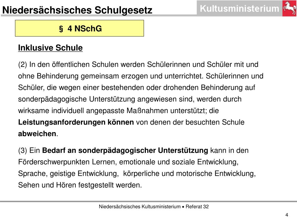 Niedersächsisches Schulgesetz § 4 NSchG Inklusive Schule (2) In den öffentlichen Schulen werden Schülerinnen und Schüler mit und ohne Behinderung gemeinsam erzogen und unterrichtet. Schülerinnen und Schüler, die wegen einer bestehenden oder drohenden Behinderung auf sonderpädagogische Unterstützung angewiesen sind, werden durch wirksame individuell angepasste Maßnahmen unterstützt; die Leistungsanforderungen können von denen der besuchten Schule abweichen. (3) Ein Bedarf an sonderpädagogischer Unterstützung kann in den Förderschwerpunkten Lernen, emotionale und soziale Entwicklung, Sprache, geistige Entwicklung, körperliche und motorische Entwicklung, Sehen und Hören festgestellt werden. 4