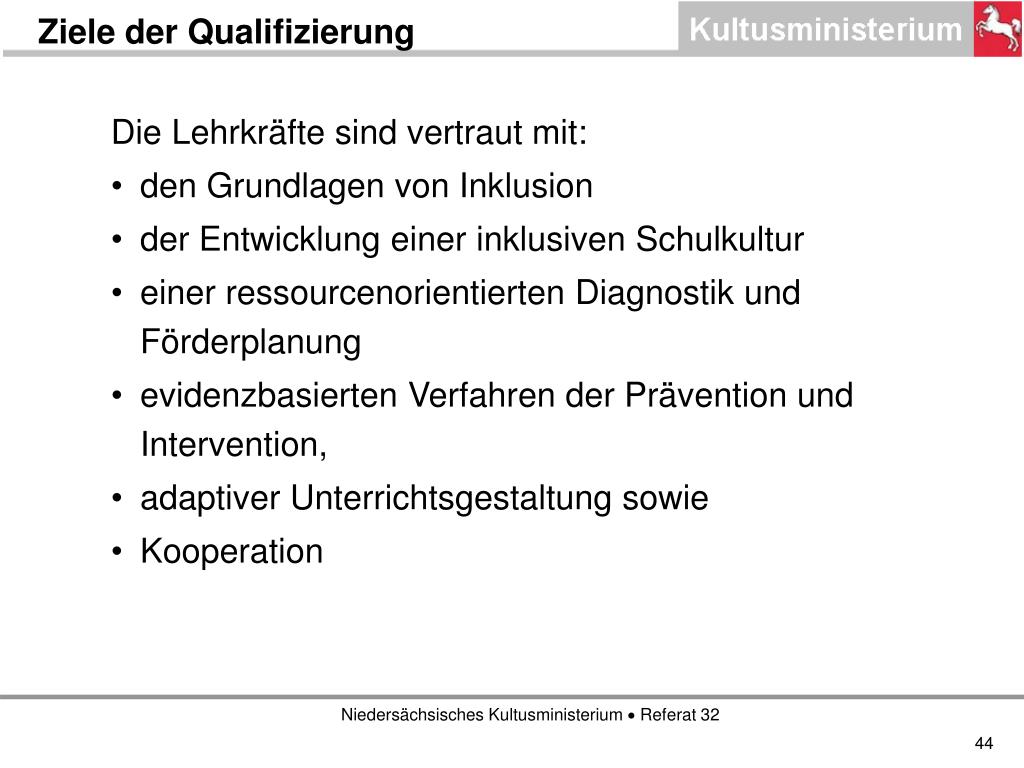 Ziele der Qualifizierung • Die Lehrkräfte sind vertraut mit: • den Grundlagen von Inklusion • der Entwicklung einer inklusiven Schulkultur • einer ressourcenorientierten Diagnostik und Förderplanung • evidenzbasierten Verfahren der Prävention und Intervention, • adaptiver Unterrichtsgestaltung sowie • Kooperation 44
