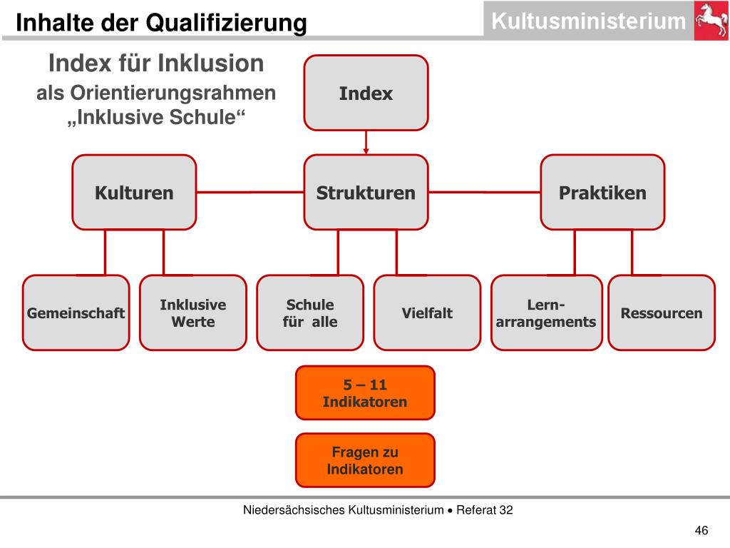 Inhalte der Qualifizierung • Grundlagen Inklusion • Der Auftrag der Inklusion • Umsetzung der BRK Artikel 24 in Niedersachsen • Schulentwicklung • Entwicklungsschritte zu einer inklusiven Schule • Einsatz wirksamer Verfahren der Schulentwicklung • Index für Inklusion 45
