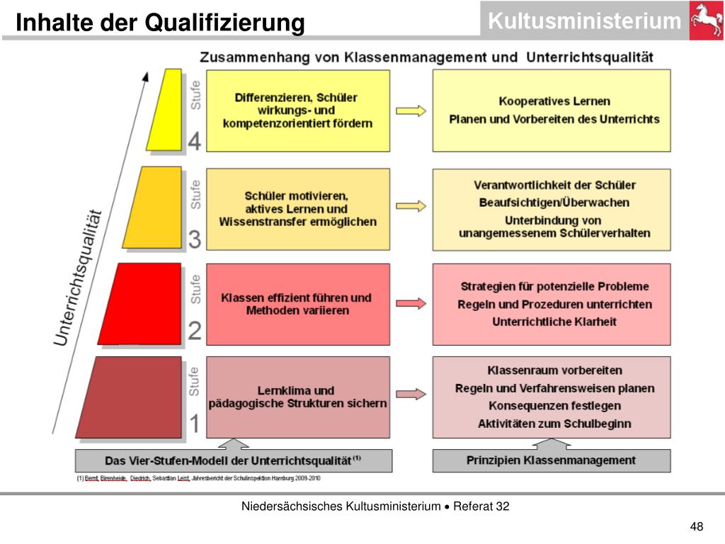 Inhalte der Qualifizierung • Unterrichtsgestaltung • Classroom Management - Klassenmanagement • Umgang mit heterogenen Lerngruppen • Wirksame Verfahren der Lernförderung und sozial-emotionaler Förderung 47