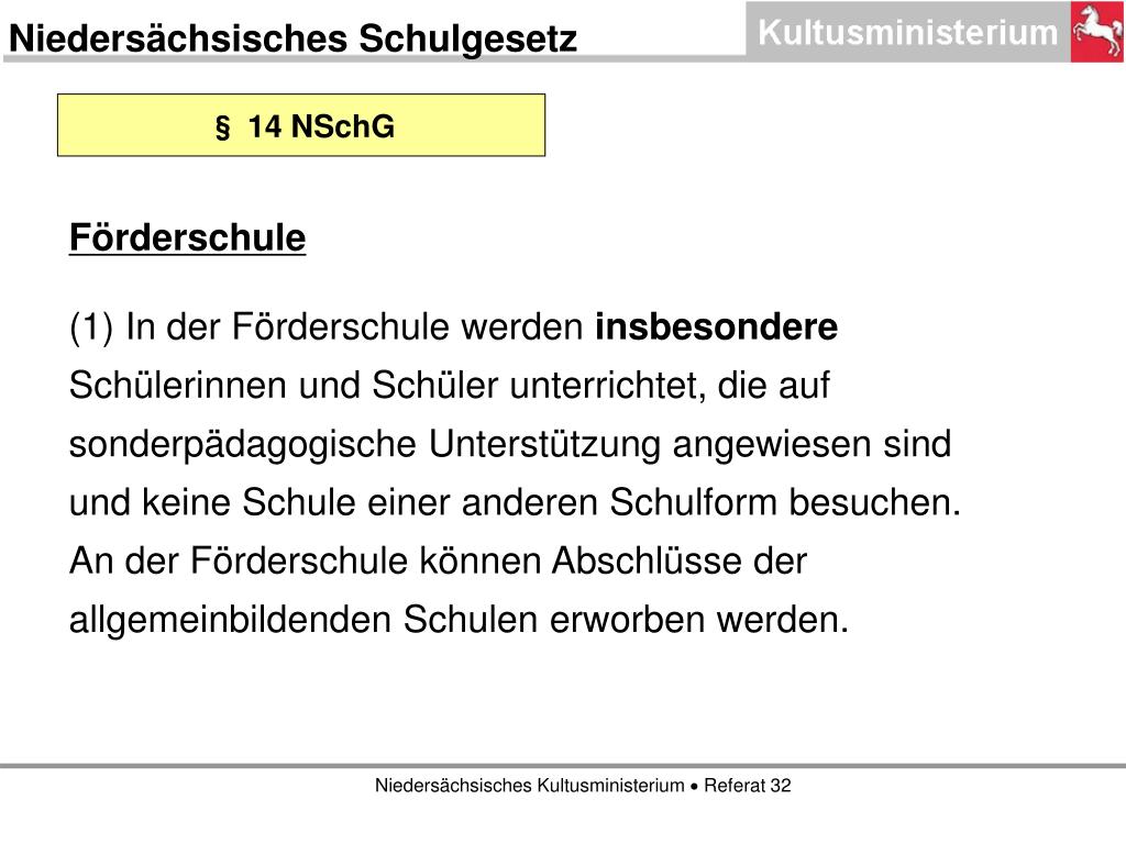 Niedersächsisches Schulgesetz § 14 NSchG Förderschule (1) In der Förderschule werden insbesondere Schülerinnen und Schüler unterrichtet, die auf sonderpädagogische Unterstützung angewiesen sind und keine Schule einer anderen Schulform besuchen. An der Förderschule können Abschlüsse der allgemeinbildenden Schulen erworben werden.