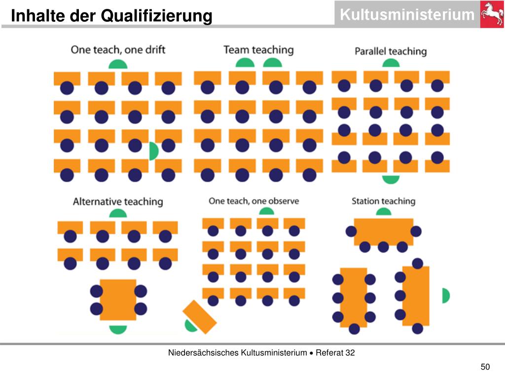 Inhalte der Qualifizierung • Prävention und Intervention • Effektive Strategien der Intervention und (selektiven/indizierten) Prävention • Wirksame Verfahren zur Intervention und Prävention im Unterricht • Kooperation, Kollegiale Fallberatung und Supervision • Grundlagen • Co-Teaching • Kollegiale Fallberatung 49
