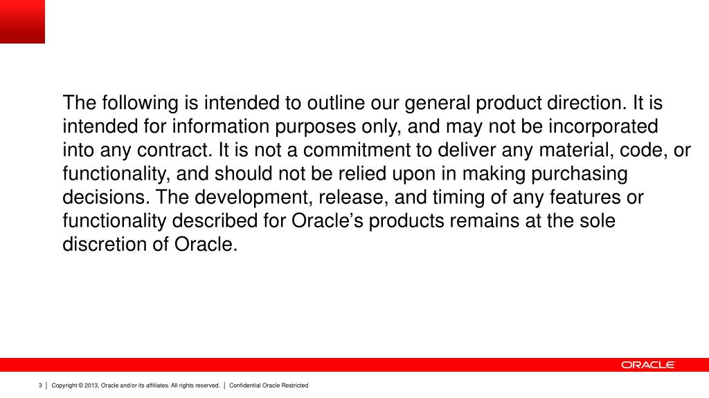 The following is intended to outline our general product direction. It is intended for information purposes only, and may not be incorporated into any contract. It is not a commitment to deliver any material, code, or functionality, and should not be relied upon in making purchasing decisions. The development, release, and timing of any features or functionality described for Oracle’s products remains at the sole discretion of Oracle.
