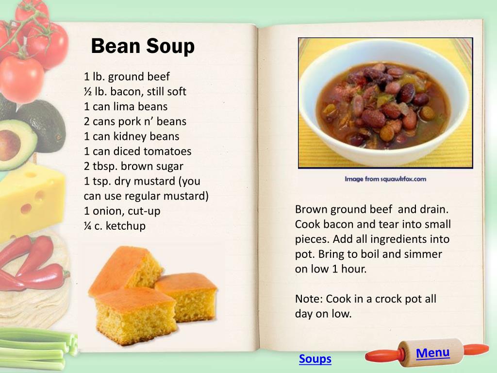 Bean Soup 1 lb. ground beef ½ lb. bacon, still soft 1 can lima beans 2 cans pork n’ beans 1 can kidney beans 1 can diced tomatoes 2 tbsp. brown sugar 1 tsp. dry mustard (you can use regular mustard) 1 onion, cut-up ¼ c. ketchup Brown ground beef and drain. Cook bacon and tear into small pieces. Add all ingredients into pot. Bring to boil and simmer on low 1 hour. Note: Cook in a crock pot all day on low. Menu Soups
