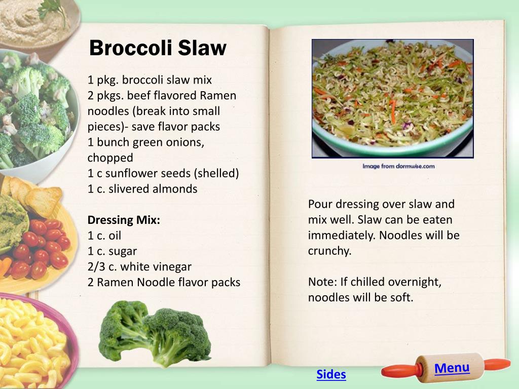 Broccoli Slaw 1 pkg. broccoli slaw mix 2 pkgs. beef flavored Ramen noodles (break into small pieces)- save flavor packs 1 bunch green onions, chopped 1 c sunflower seeds (shelled) 1 c. slivered almonds Dressing Mix: 1 c. oil 1 c. sugar 2/3 c. white vinegar 2 Ramen Noodle flavor packs Pour dressing over slaw and mix well. Slaw can be eaten immediately. Noodles will be crunchy. Note: If chilled overnight, noodles will be soft. Menu Sides