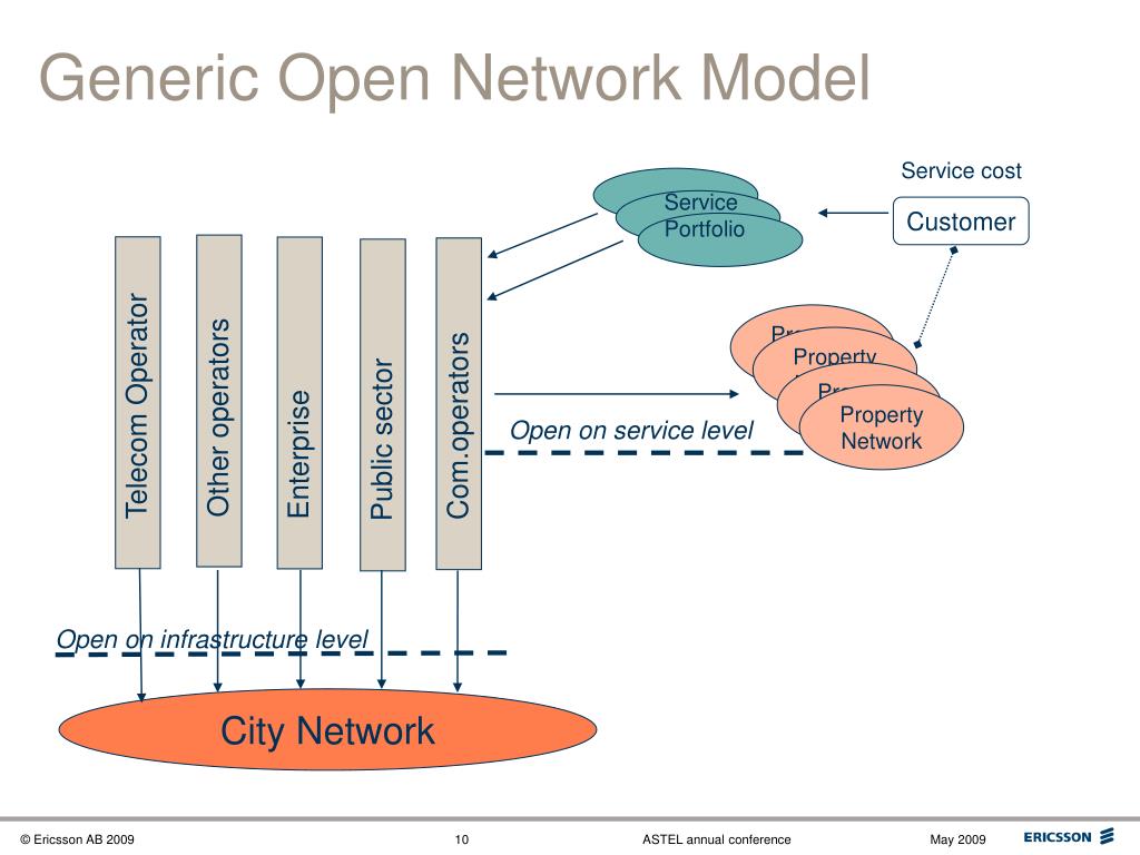 Enterprise Telecom Operator Public sector Other operators Com.operators Property Network Property Network Property Network Property Network Generic Open Network Model Service cost Service Portfolio Customer Open on service level Open on infrastructure level City Network