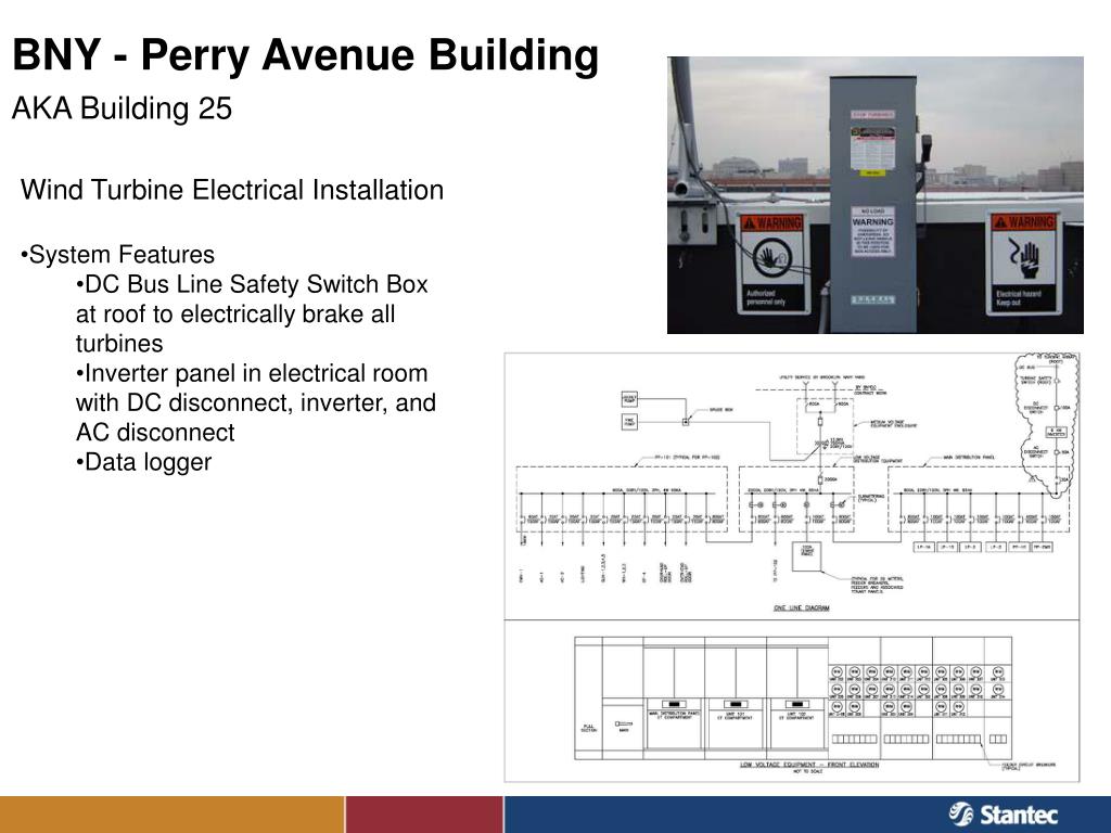 BNY - Perry Avenue Building AKA Building 25 • Wind Turbine Electrical Installation • System Features • DC Bus Line Safety Switch Box at roof to electrically brake all turbines • Inverter panel in electrical room with DC disconnect, inverter, and AC disconnect • Data logger