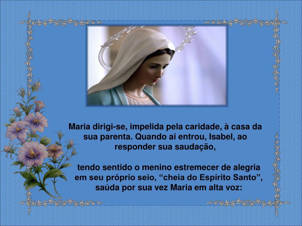 Maria dirigi-se, impelida pela caridade, à casa da sua parenta. Quando ai entrou, Isabel, ao responder sua saudação, tendo sentido o menino estremecer de alegria em seu próprio seio, “cheia do Espírito Santo”, saúda por sua vez Maria em alta voz: