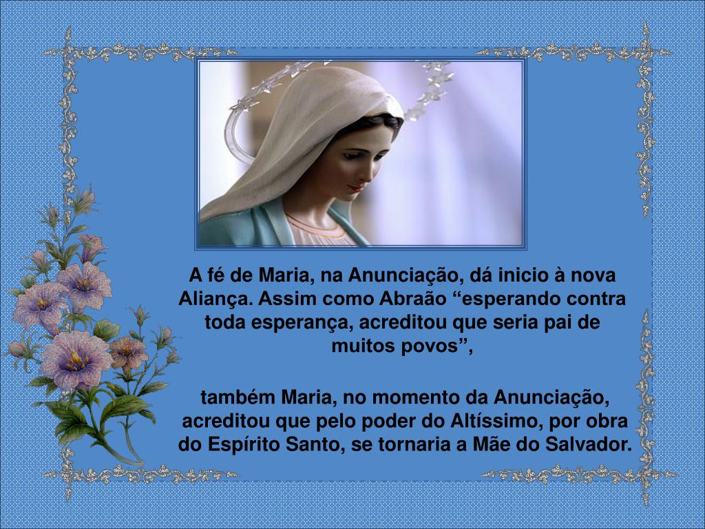 A fé de Maria, na Anunciação, dá inicio à nova Aliança. Assim como Abraão “esperando contra toda esperança, acreditou que seria pai de muitos povos”, também Maria, no momento da Anunciação, acreditou que pelo poder do Altíssimo, por obra do Espírito Santo, se tornaria a Mãe do Salvador.