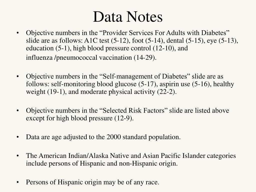 Data Notes • Objective numbers in the “Provider Services For Adults with Diabetes” slide are as follows: A1C test (5-12), foot (5-14), dental (5-15), eye (5-13), education (5-1), high blood pressure control (12-10), and influenza /pneumococcal vaccination (14-29). • Objective numbers in the “Self-management of Diabetes” slide are as follows: self-monitoring blood glucose (5-17), aspirin use (5-16), healthy weight (19-1), and moderate physical activity (22-2). • Objective numbers in the “Selected Risk Factors” slide are listed above except for high blood pressure (12-9). • Data are age adjusted to the 2000 standard population. • The American Indian/Alaska Native and Asian Pacific Islander categories include persons of Hispanic and non-Hispanic origin. • Persons of Hispanic origin may be of any race.