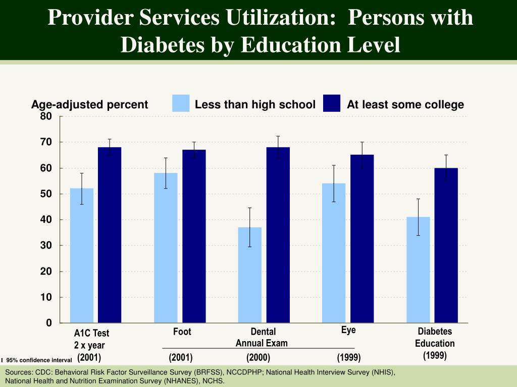 Provider Services Utilization: Persons with Diabetes by Education Level Age-adjusted percent Less than high school At least some college Eye Diabetes Education (1999) Foot Dental A1C Test 2 x year Annual Exam (2001) (2001) (2000) (1999) I 95% confidence interval Sources: CDC: Behavioral Risk Factor Surveillance Survey (BRFSS), NCCDPHP; National Health Interview Survey (NHIS), National Health and Nutrition Examination Survey (NHANES), NCHS.