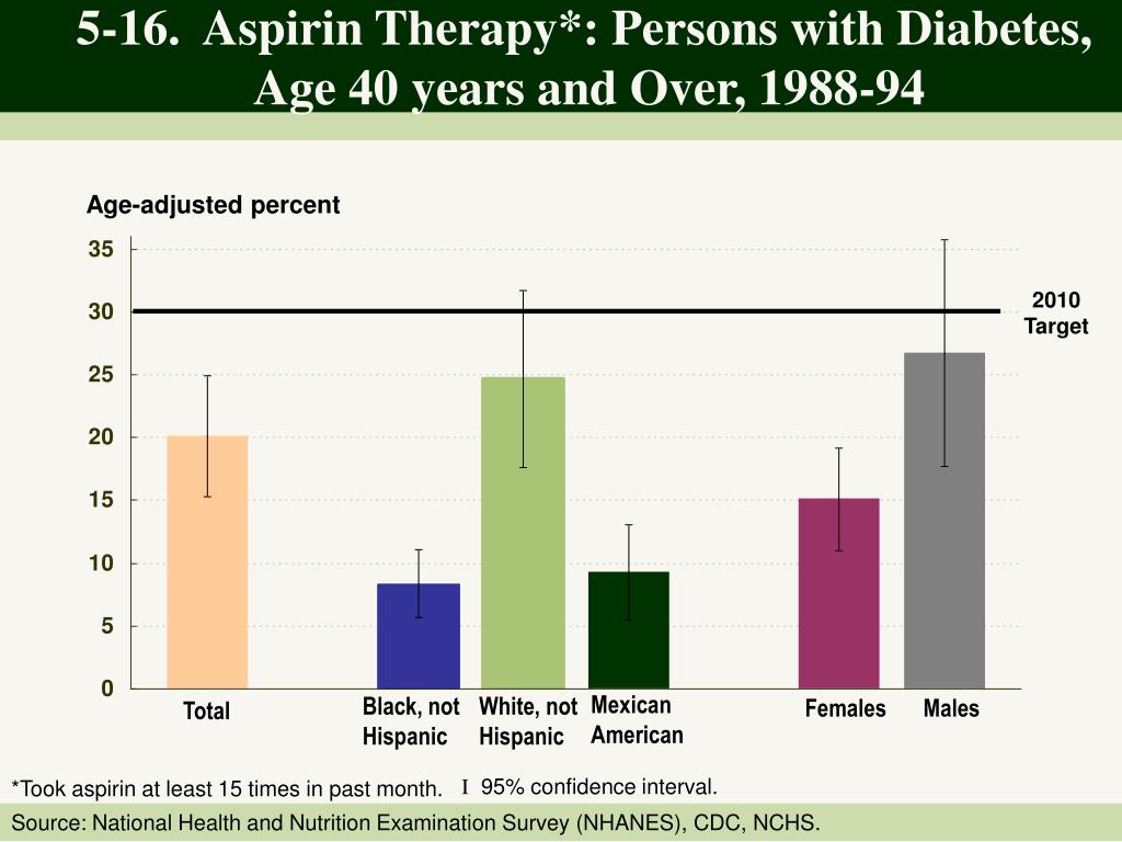 5-16. Aspirin Therapy*: Persons with Diabetes, Age 40 years and Over, 1988-94 Age-adjusted percent 2010 Target Mexican American Black, not Hispanic White, not Hispanic Females Males Total I 95% confidence interval. *Took aspirin at least 15 times in past month. Source: National Health and Nutrition Examination Survey (NHANES), CDC, NCHS.