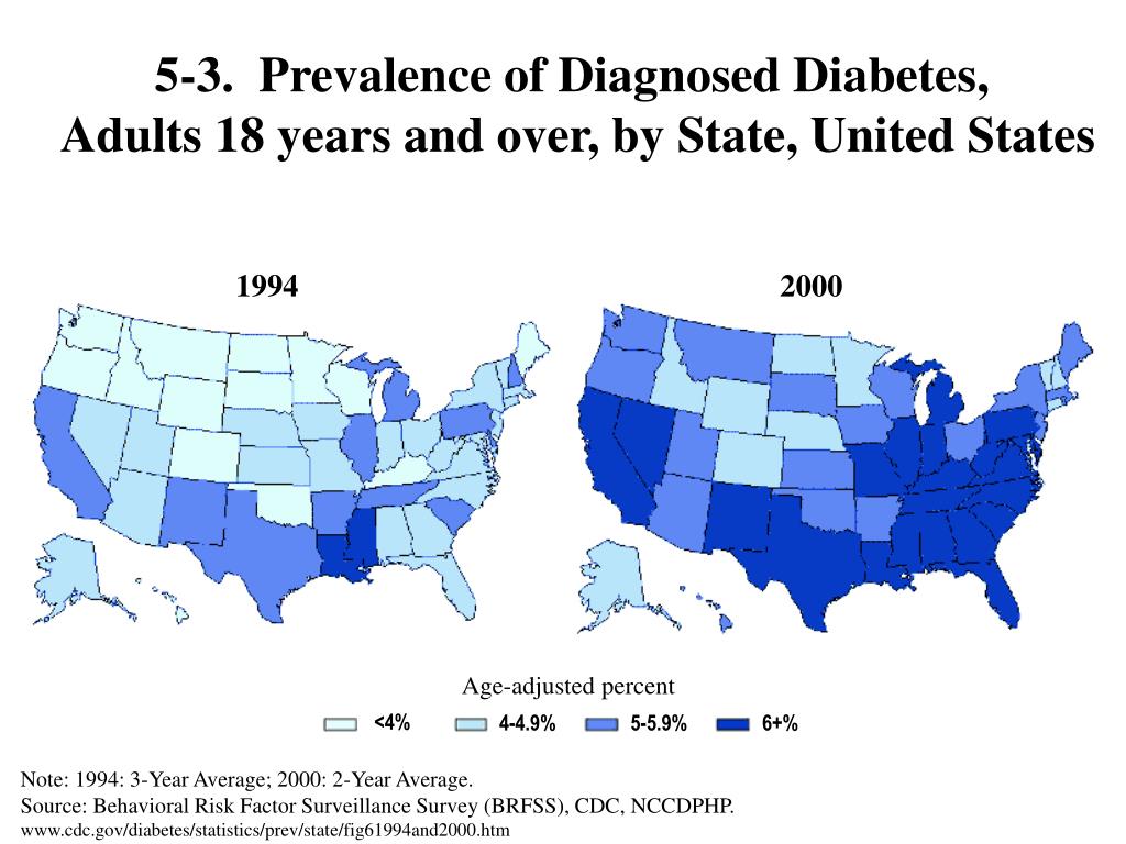 5-3. Prevalence of Diagnosed Diabetes, Adults 18 years and over, by State, United States 1994 2000 Age-adjusted percent <4% 4-4.9% 5-5.9% 6+% Note: 1994: 3-Year Average; 2000: 2-Year Average.Source: Behavioral Risk Factor Surveillance Survey (BRFSS), CDC, NCCDPHP. www.cdc.gov/diabetes/statistics/prev/state/fig61994and2000.htm