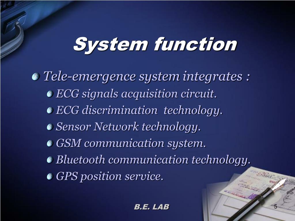 System function • Tele-emergence systemintegrates : • ECG signals acquisition circuit. • ECG discrimination technology. • Sensor Network technology. • GSM communication system. • Bluetooth communication technology. • GPS position service. B.E. LAB