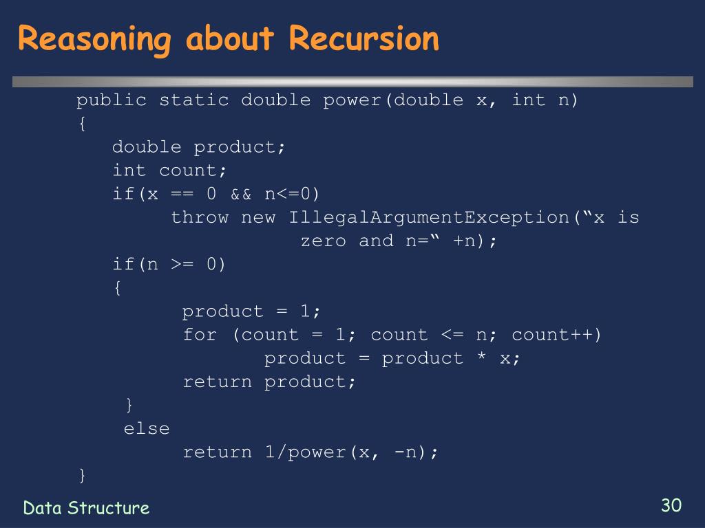 Reasoning about Recursion public static double power(double x, int n) { double product; int count; if(x == 0 && n<=0) throw new IllegalArgumentException(“x is zero and n=“ +n); if(n >= 0) { product = 1; for (count = 1; count <= n; count++) product = product * x; return product; } else return 1/power(x, -n); } Data Structure