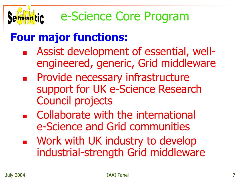 e-Science Core Program Four major functions: • Assist development of essential, well-engineered, generic, Grid middleware • Provide necessary infrastructure support for UK e-Science Research Council projects • Collaborate with the international e-Science and Grid communities • Work with UK industry to develop industrial-strength Grid middleware IAAI Panel