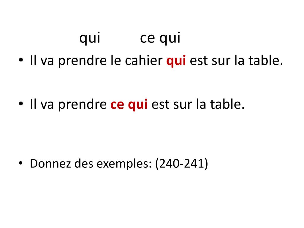 qui ce qui • Il vaprendre le cahier quiestsur la table. • Il vaprendrece qui estsur la table. • Donnez des exemples: (240-241)