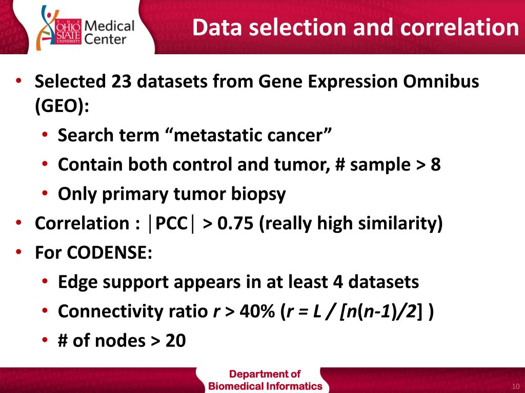 Data selection and correlation • Selected 23 datasets from Gene Expression Omnibus (GEO): • Search term “metastatic cancer” • Contain both control and tumor, # sample > 8 • Only primary tumor biopsy • Correlation : │PCC│ > 0.75 (really high similarity) • For CODENSE: • Edge support appears in at least 4 datasets • Connectivity ratio r > 40% (r = L / [n(n-1)/2] ) • # of nodes > 20