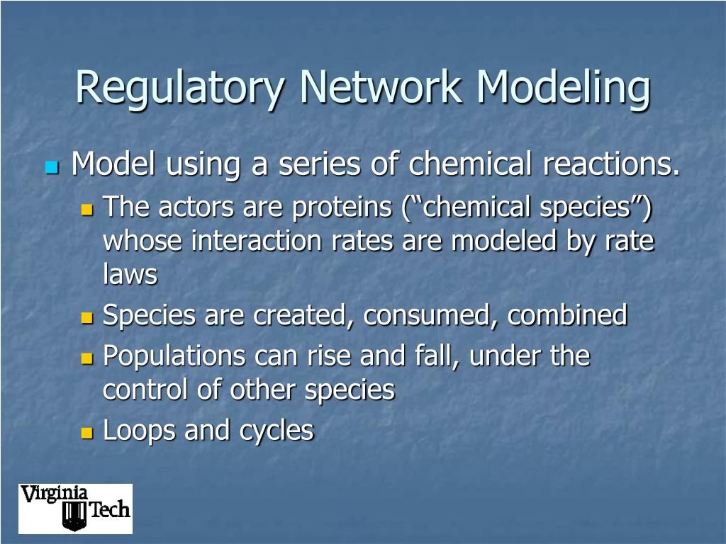 Regulatory Network Modeling • Model using a series of chemical reactions. • The actors are proteins (“chemical species”) whose interaction rates are modeled by rate laws • Species are created, consumed, combined • Populations can rise and fall, under the control of other species • Loops and cycles