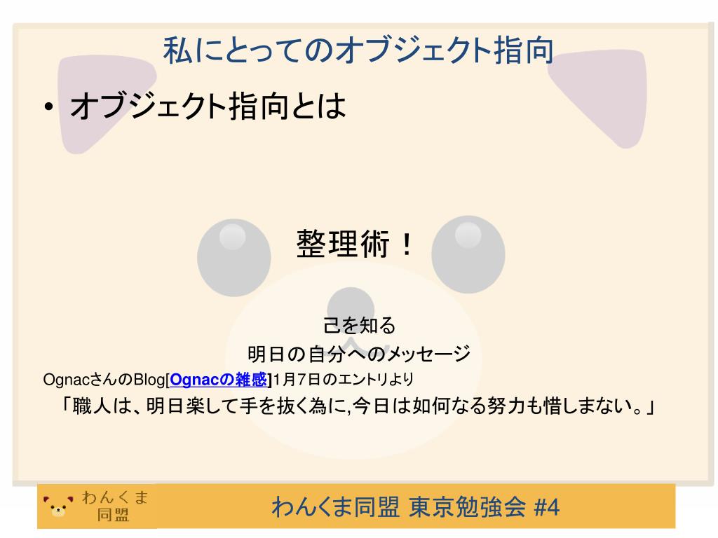 私にとってのオブジェクト指向 • オブジェクト指向とは 整理術! 己を知る 明日の自分へのメッセージ OgnacさんのBlog[Ognacの雑感]1月7日のエントリより 「職人は、明日楽して手を抜く為に,今日は如何なる努力も惜しまない。」