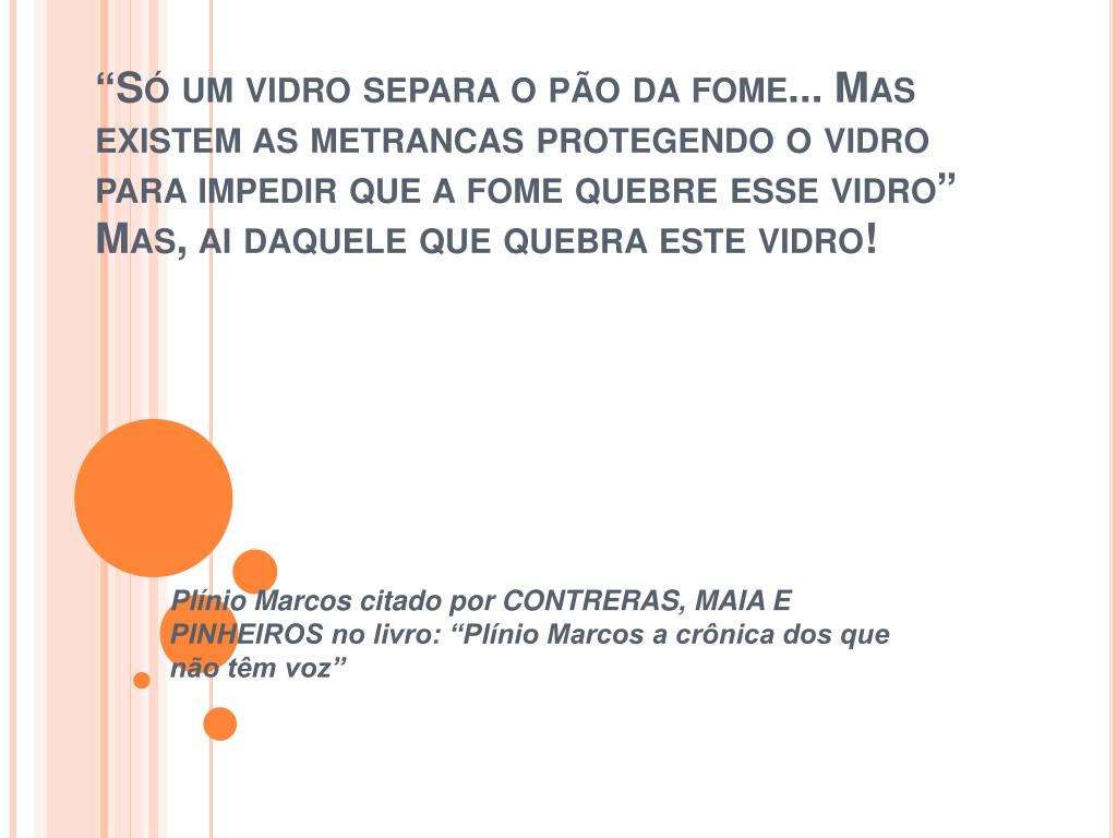 “Só um vidro separa o pão da fome... Mas existem as metrancas protegendo o vidro para impedir que a fome quebre esse vidro”Mas, ai daquele que quebra este vidro! Plínio Marcos citado por CONTRERAS, MAIA E PINHEIROS no livro: “Plínio Marcos a crônica dos que não têm voz”