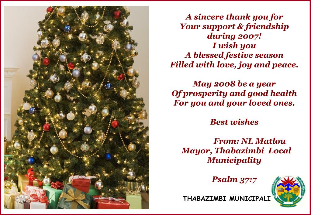 Season’s Greeting’s. Cllr NL Matlou Mayor of Thabazimbi. www.thabazimbi.gov.za. A sincere thank you for Your support & friendship during 2007! I wish you A blessed festive season Filled with love, joy and peace. May 2008 be a year Of prosperity and good health