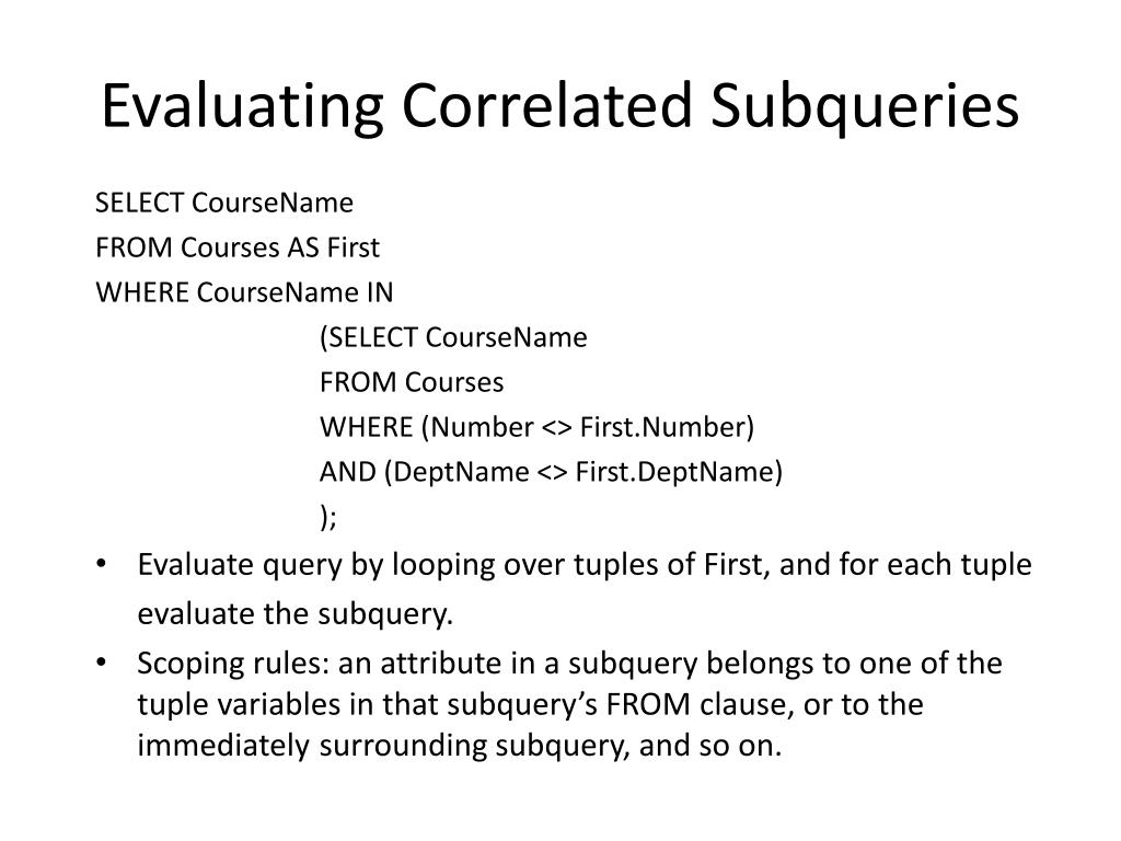 Evaluating Correlated Subqueries SELECT CourseName FROM Courses AS First WHERE CourseName IN (SELECT CourseName FROM Courses WHERE (Number <> First.Number) AND (DeptName <> First.DeptName) ); • Evaluate query by looping over tuples of First, and for each tuple evaluate the subquery. • Scoping rules: an attribute in a subquery belongs to one of the tuple variables in that subquery’s FROM clause, or to the immediately surrounding subquery, and so on.