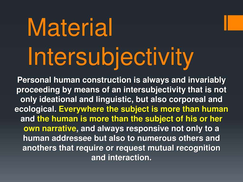 Material Intersubjectivity Personal human construction is always and invariably proceeding by means of an intersubjectivity that is not only ideational and linguistic, but also corporeal and ecological. Everywhere the subject is more than human and the human is more than the subject of his or her own narrative, and always responsive not only to a human addressee but also to numerous others and anothers that require or request mutual recognition and interaction.