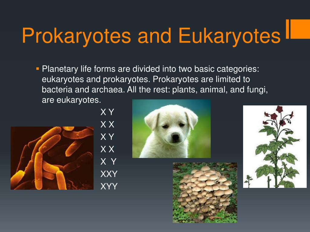 Prokaryotes and Eukaryotes • Planetary life forms are divided into two basic categories: eukaryotes and prokaryotes. Prokaryotes are limited to bacteria and archaea. All the rest: plants, animal, and fungi, are eukaryotes. X Y X X X Y X X X Y XXY XYY