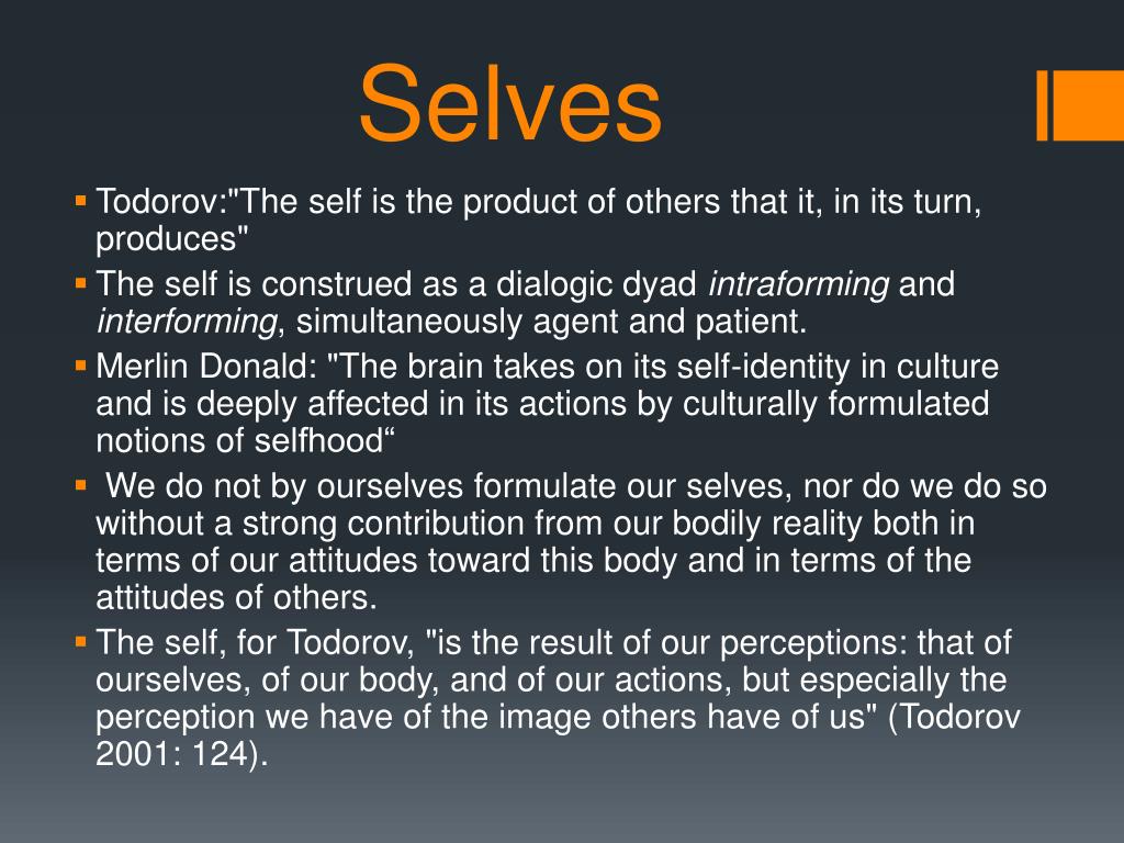 Selves • Todorov:"The self is the product of others that it, in its turn, produces" • The self is construed as a dialogic dyad intraforming and interforming, simultaneously agent and patient. • Merlin Donald: "The brain takes on its self-identity in culture and is deeply affected in its actions by culturally formulated notions of selfhood“ • We do not by ourselves formulate our selves, nor do we do so without a strong contribution from our bodily reality both in terms of our attitudes toward this body and in terms of the attitudes of others. • The self, for Todorov, "is the result of our perceptions: that of ourselves, of our body, and of our actions, but especially the perception we have of the image others have of us" (Todorov 2001: 124).