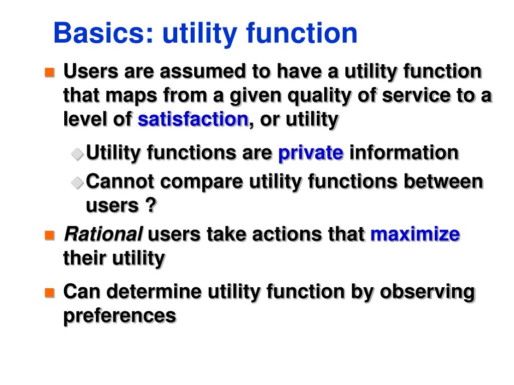 Basics: utility function • Users are assumed to have a utility function that maps from a given quality of service to a level of satisfaction, or utility • Utility functions are private information • Cannot compare utility functions between users ? • Rational users take actions that maximize their utility • Can determine utility function by observing preferences