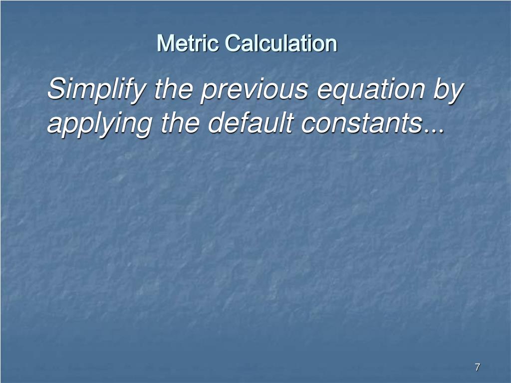 Metric Calculation Simplify the previous equation by applying the default constants…