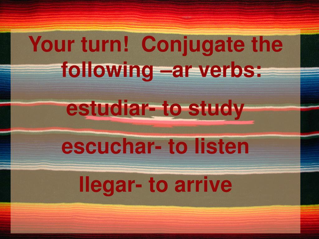 Your turn! Conjugate the following –ar verbs: estudiar- to study escuchar- to listen llegar- to arrive